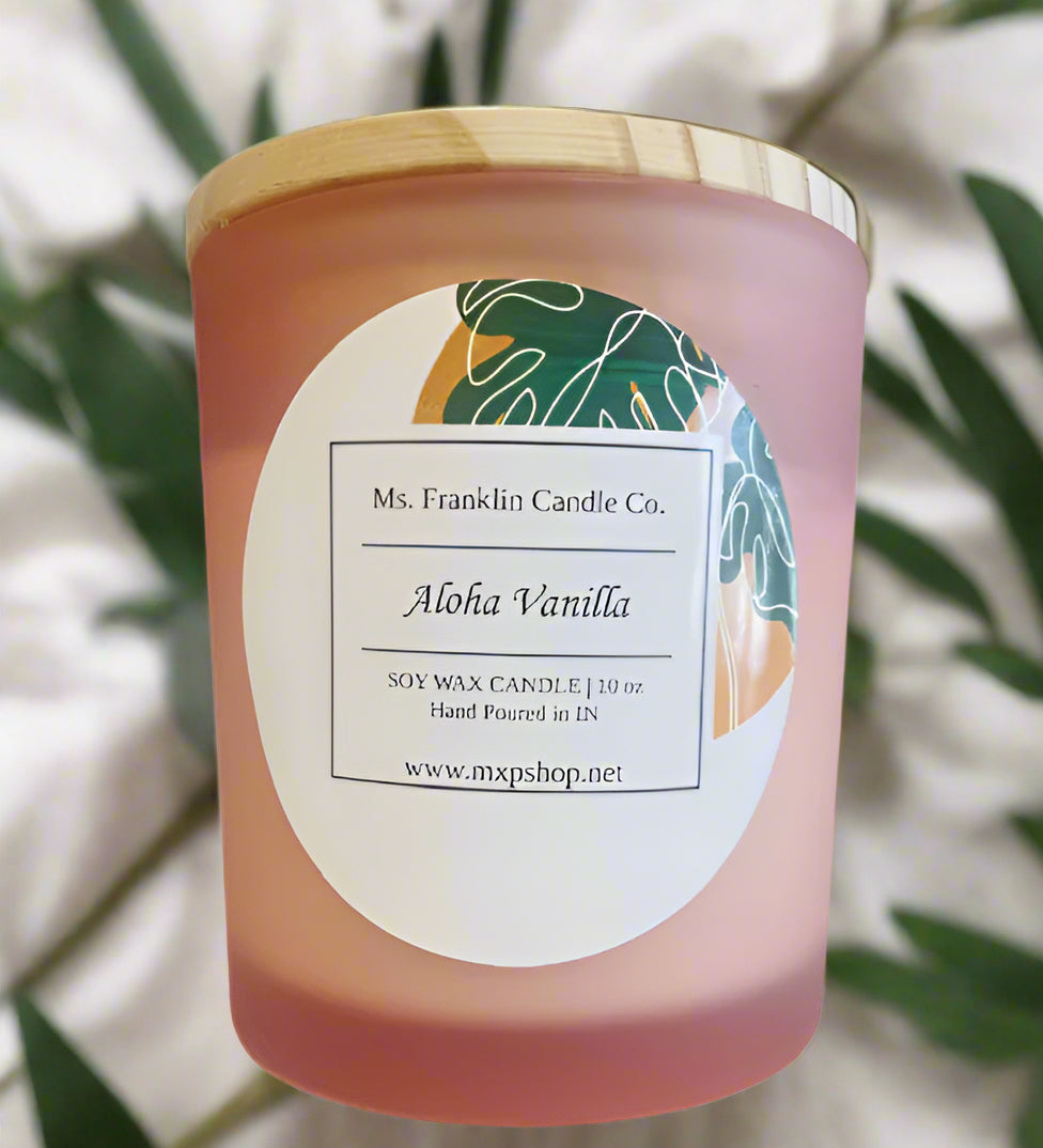 Indulge in the tropical and inviting scent of Aloha Vanilla with our scented candle. Let the warm and comforting aroma transport you to a peaceful paradise. Relax and unwind as the rich vanilla notes fill the air. Perfect for creating a serene ambiance or as a thoughtful gift. This candle is crafted with an all natural soy wax blend and fragranced with high quality oils. The cotton wick ensures a clean, long-lasting burn. Transform your space into a tranquil oasis with every light.