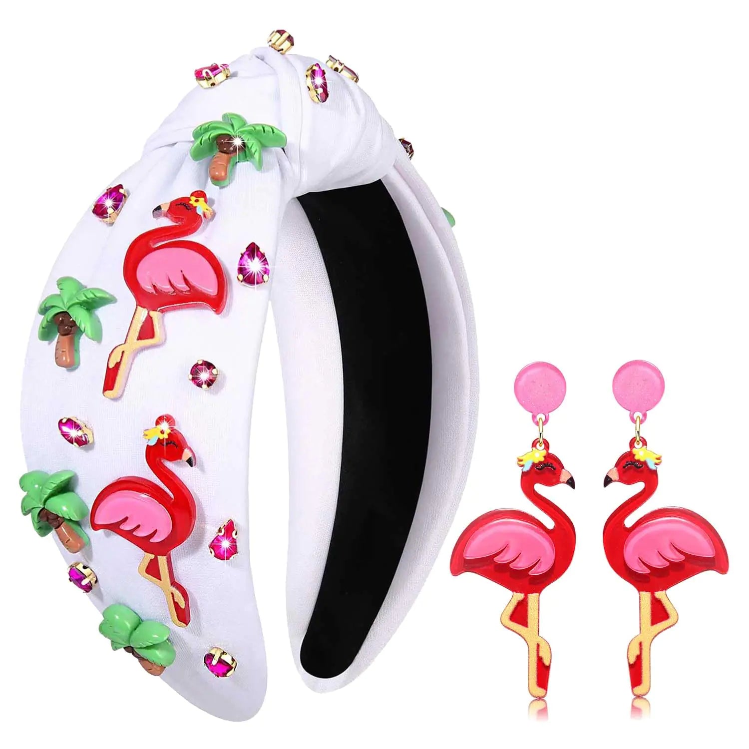 Jeweled Boho Knotted Rhinestone Crystal Wide Top Knot Headband for Women - Tropical Vacation Outfits Hair Accessory (Flamingo 1)