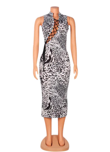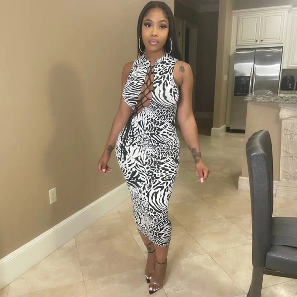 Featuring a unique hollow out bandage style that adds a touch of sophistication, this dress is perfect for any occasion. The mid waist design ensures a flattering fit, while the sleeveless style keeps you comfortable and cool.